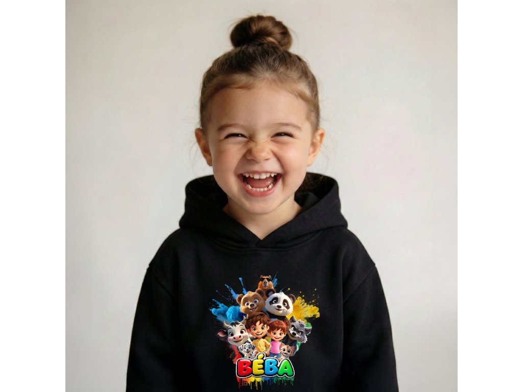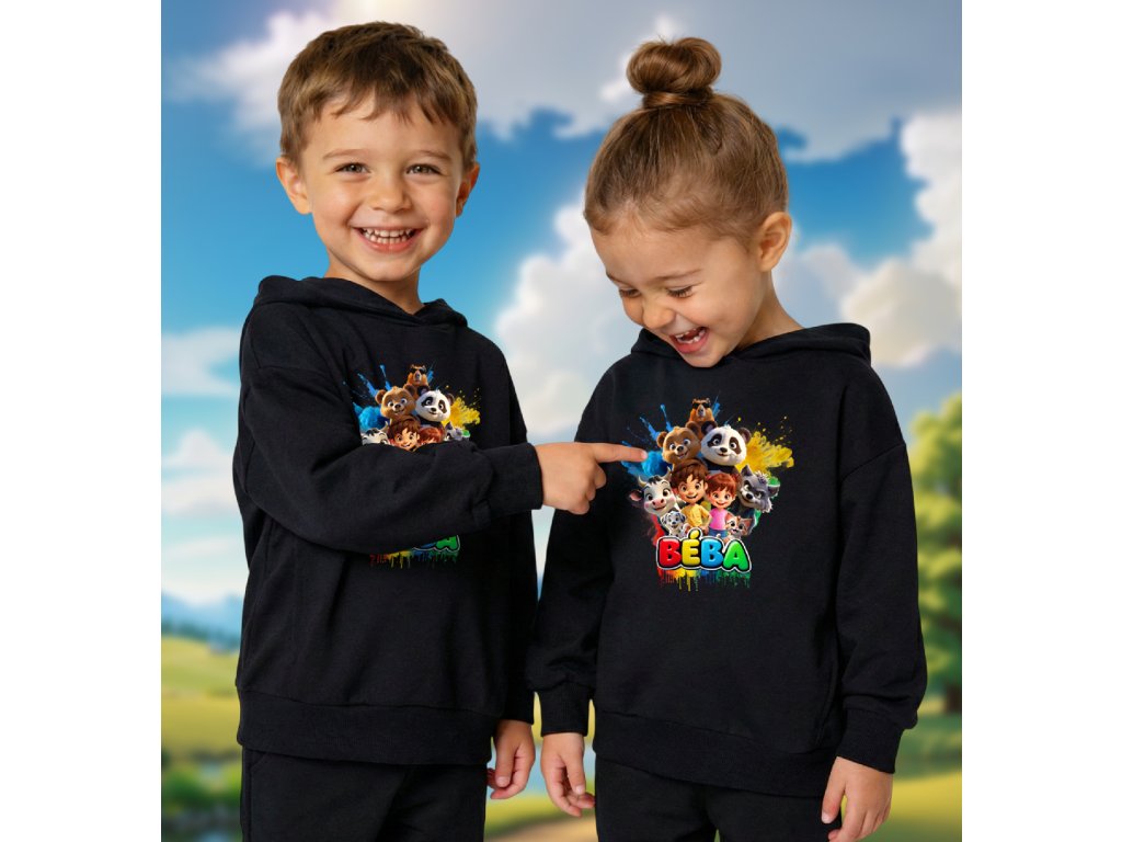 Černá mikina s kapucí a motivem kreslených postaviček, které znáte z našich písní.